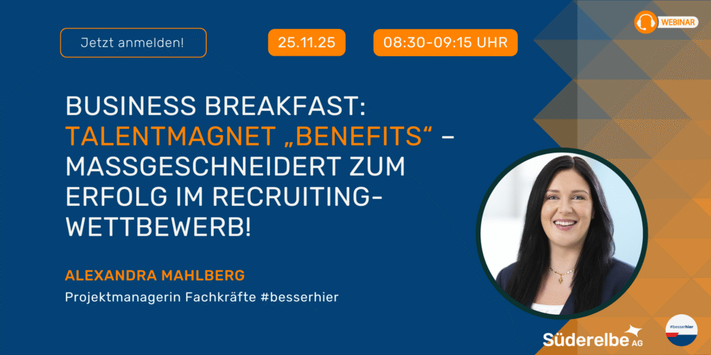 📆 25.11.2025 🕗 08:30 - 09:15 Uhr 📌 online via Teams | Der Fachkräftemarkt ist hart umkämpft – Unternehmen stehen zunehmend vor der Herausforderung, qualifizierte Talente nicht nur zu finden, sondern auch langfristig zu binden. Doch wie gelingt es, sich im Wettbewerb um die besten Köpfe erfolgreich zu positionieren? Was Sie erwartet: -Ein kurzer, umfassender Leitfaden zum Finden der richtigen Benefits für Ihr Unternehmen -Einblick in aktuelle Trends und Erwartungen der Arbeitswelt von morgen -Erfolgsfaktoren für wirksame und authentische Benefits -Best Practices aus der Region und darüber hinaus -Zeit für Austausch und Fragen in entspannter Frühstücksatmosphäre – online, aber persönlich